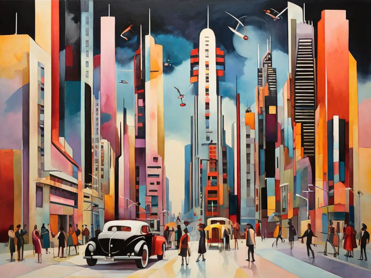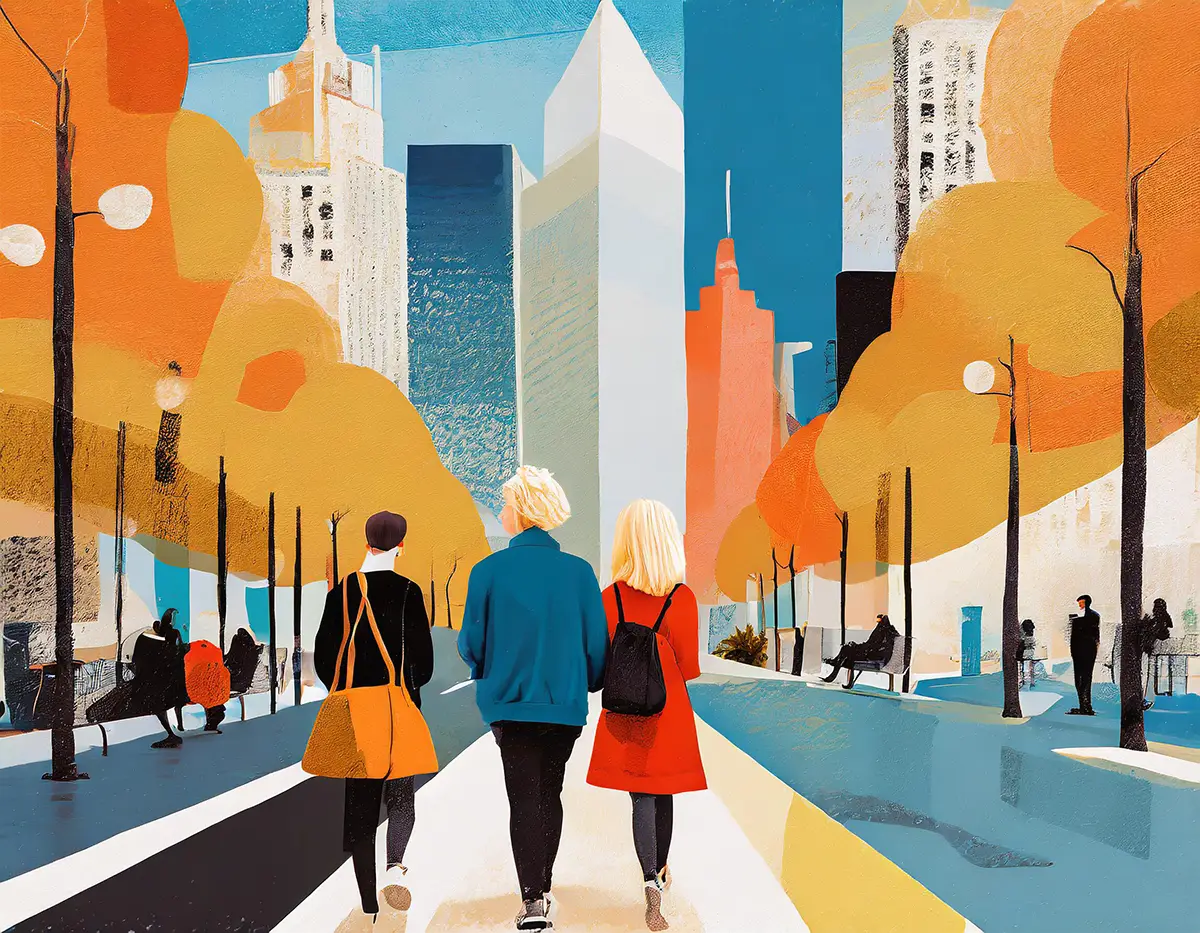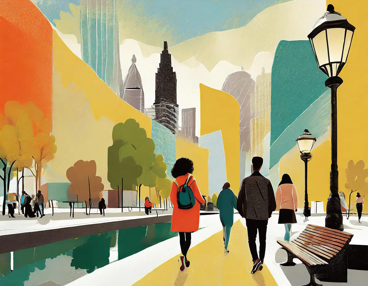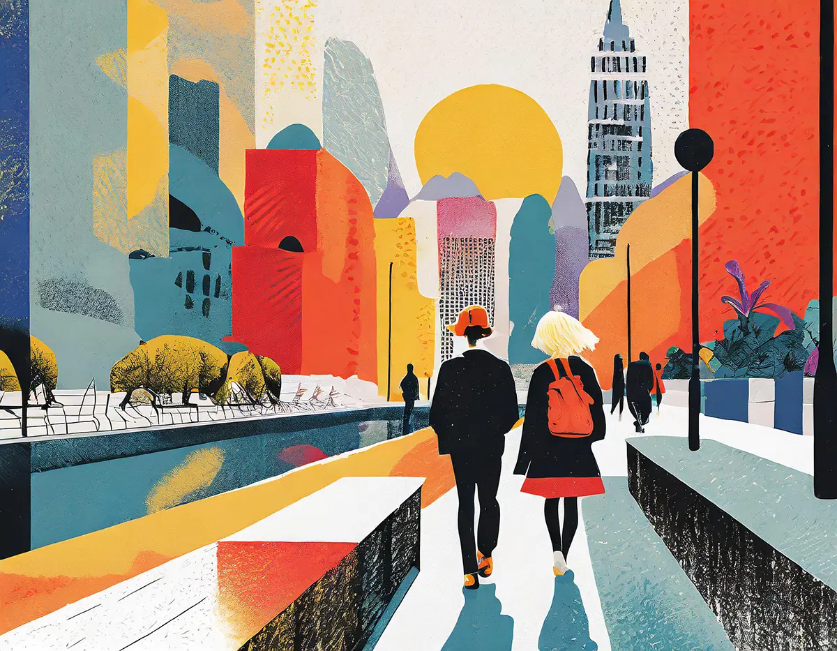In der Stadt spazieren gehen gefällt uns doch allen gut, oder? Der Prompt für die ersten vier Bilder enthielt u.a. scene in the city with some people; mixed media collage, abstract, modern art, contemporare colors