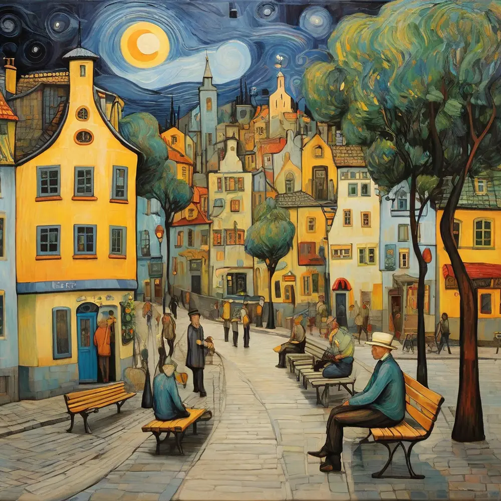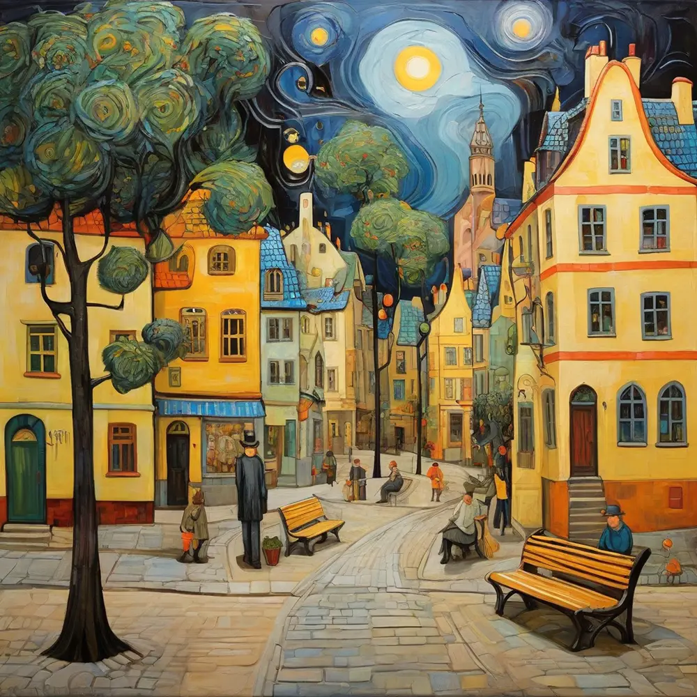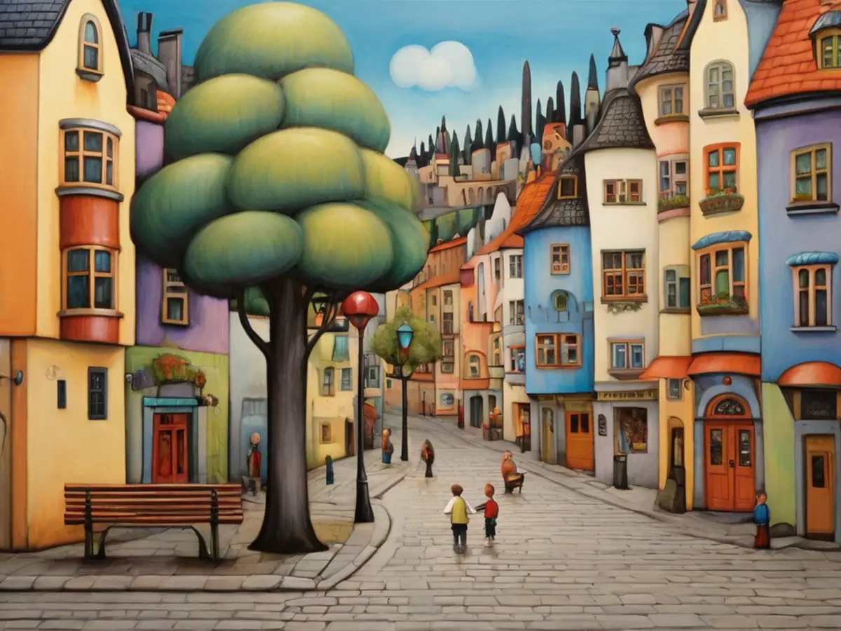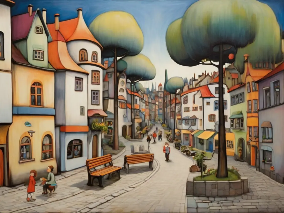 In der Stadt spazieren gehen gefällt uns doch allen gut, oder? Der Prompt für die ersten vier Bilder enthielt u.a. scene in the city with some people; mixed media collage, abstract, modern art, contemporare colors
