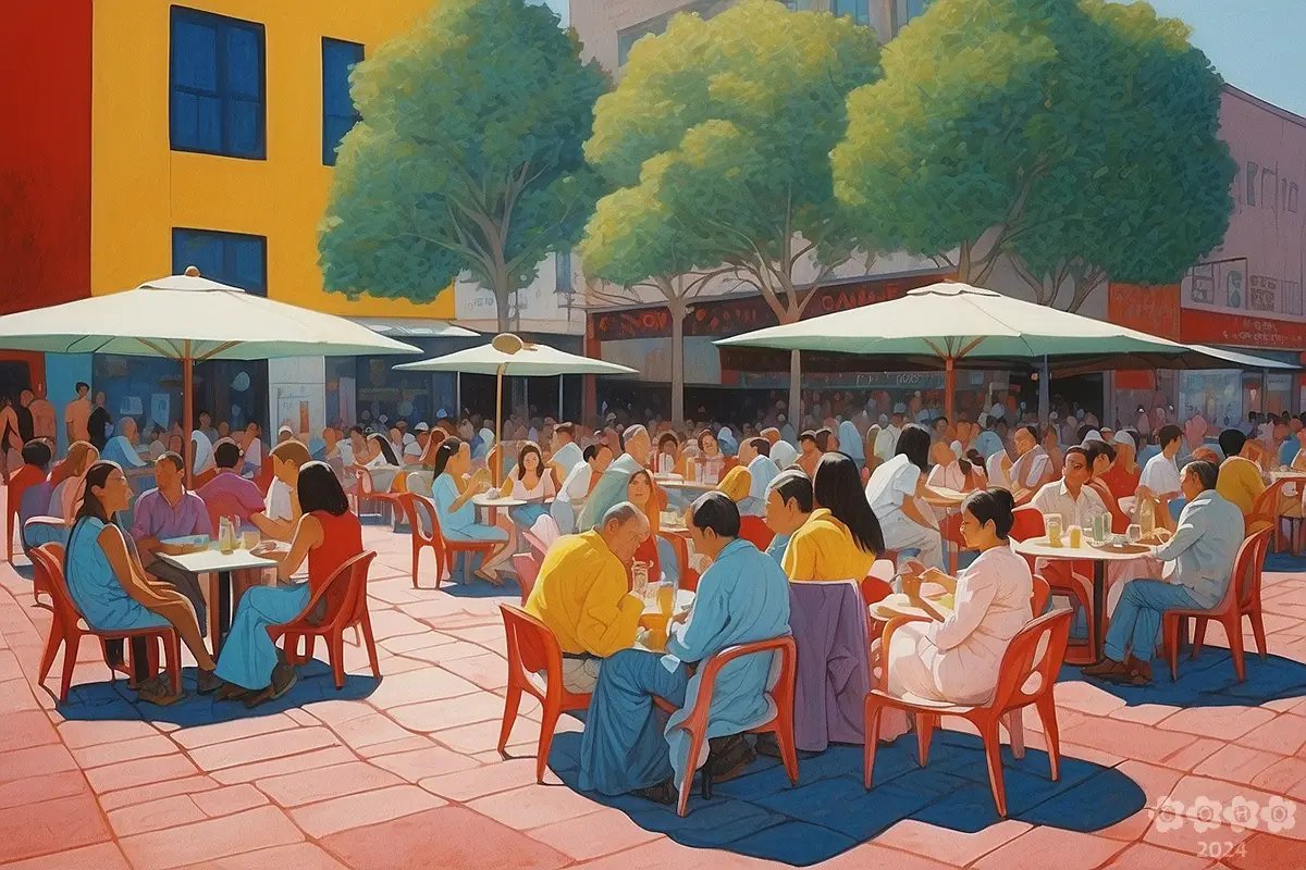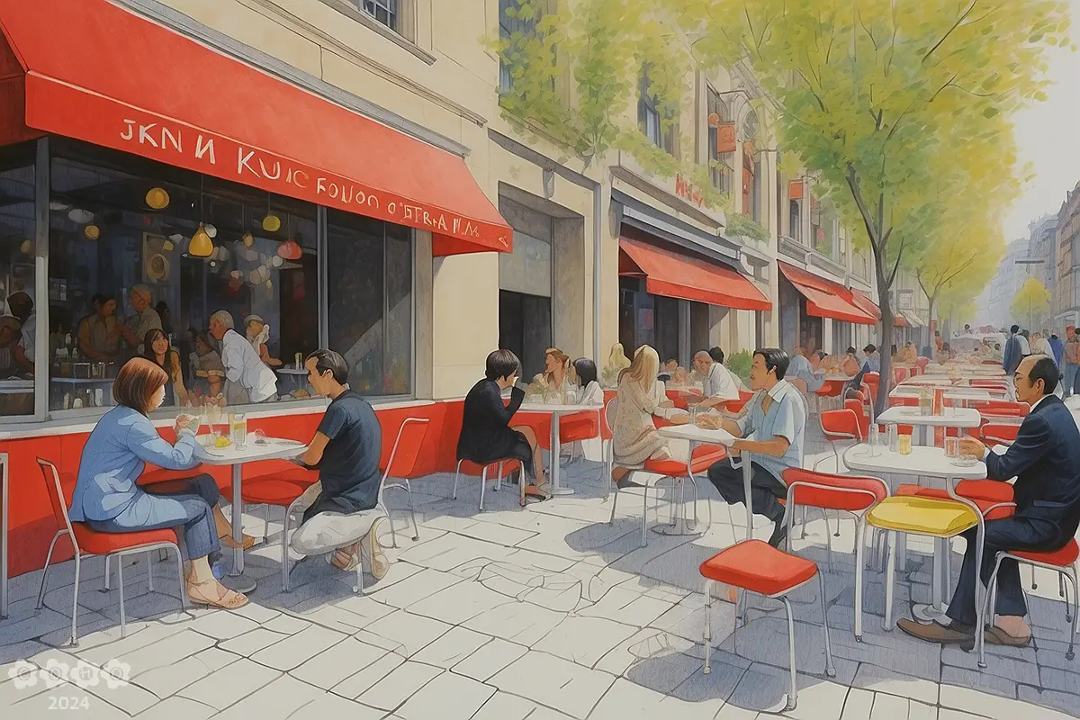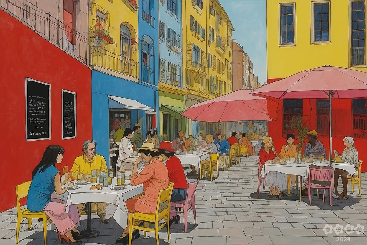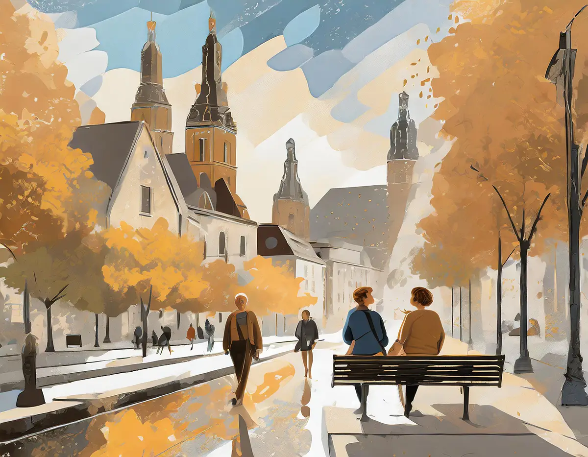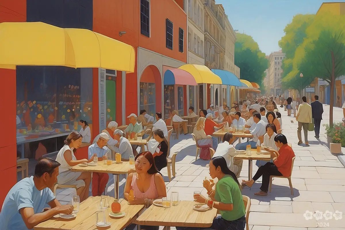 In der Stadt spazieren gehen gefällt uns doch allen gut, oder? Der Prompt für die ersten vier Bilder enthielt u.a. scene in the city with some people; mixed media collage, abstract, modern art, contemporare colors