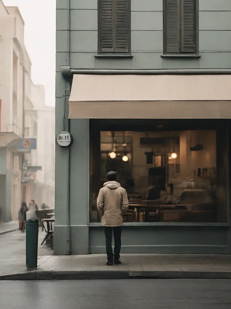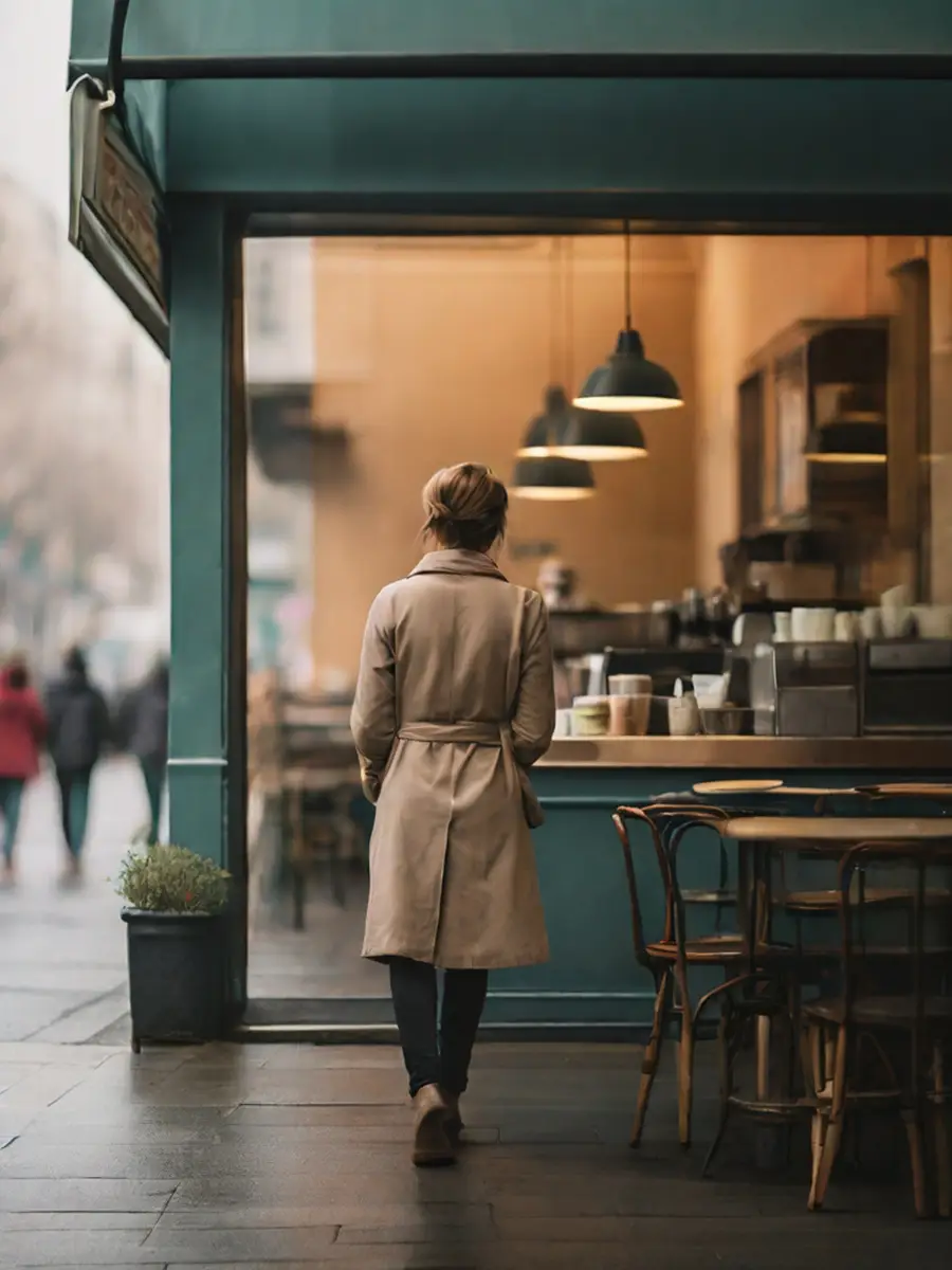 In der City gehe ich gerne ins Café – allerdings bekomme ich dort nicht so einen Riesen-Milchkaffee wie hier von Adobe Firefly generiert.