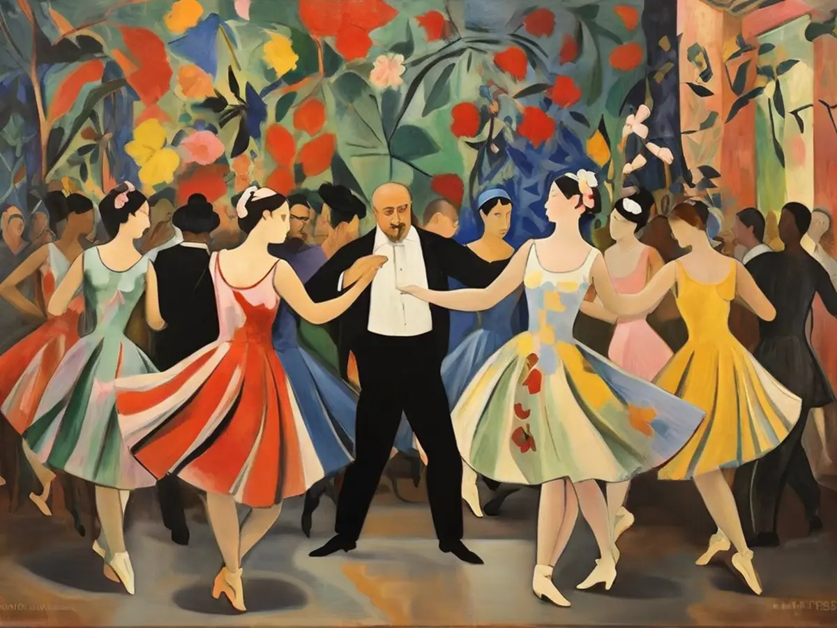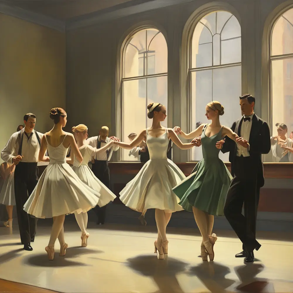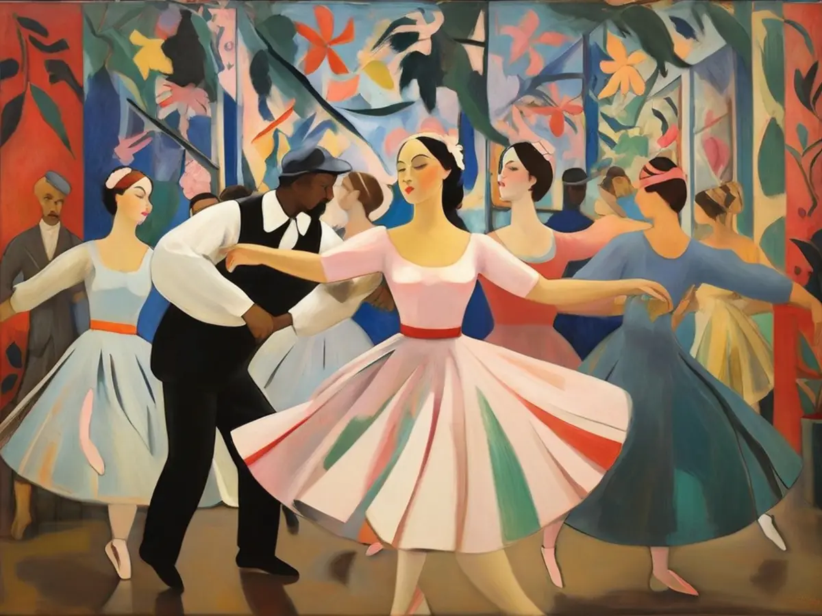 Die folgenden Tanzszenen wurden im Stil von Marc Chagall (hochkant), Henri Matisse (quer) und Edward Hopper (quadratisch) generiert.