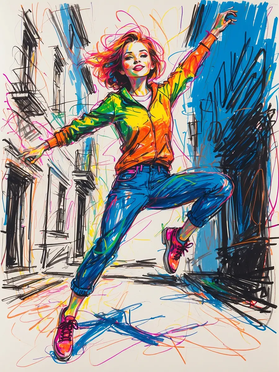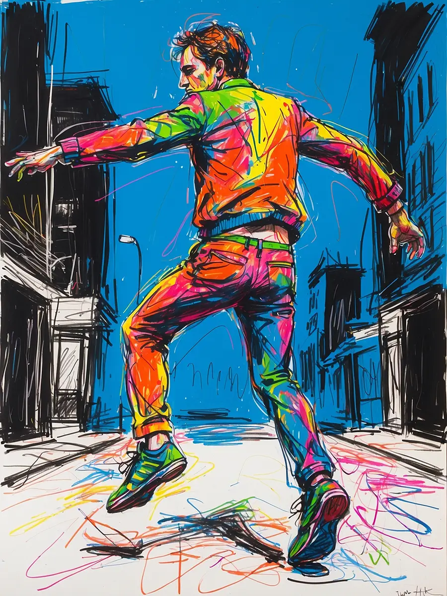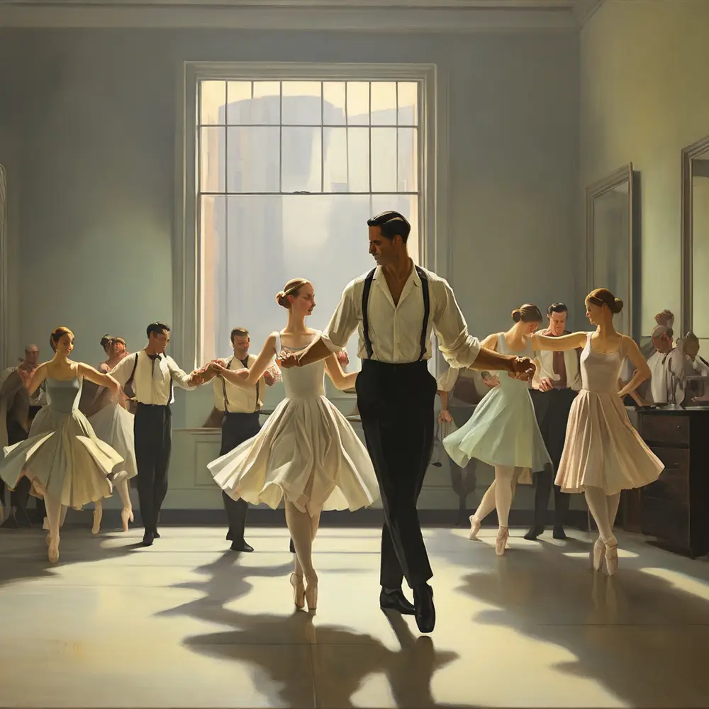 Die folgenden Tanzszenen wurden im Stil von Marc Chagall (hochkant), Henri Matisse (quer) und Edward Hopper (quadratisch) generiert.
